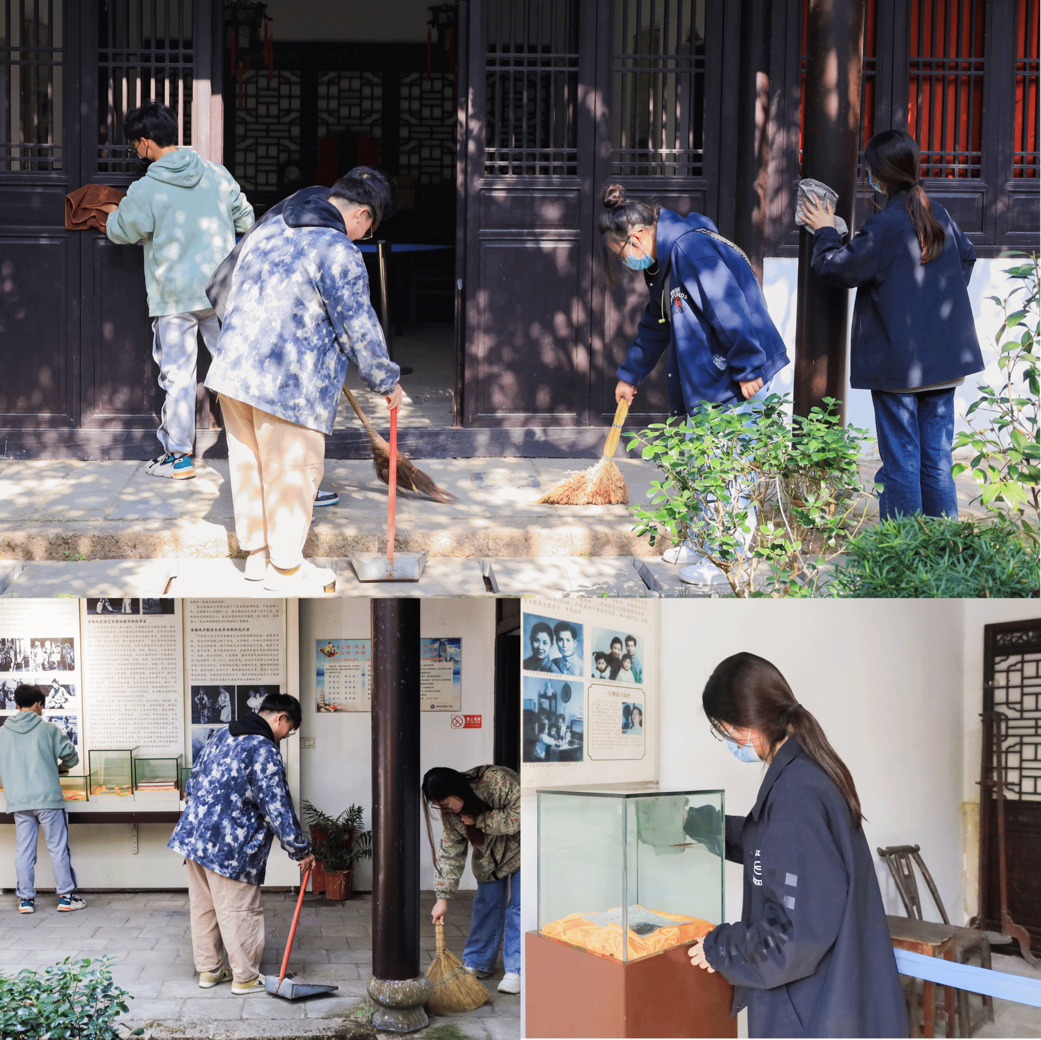 乘坐一个多小时的公交后,志愿者们来到了严凤英故居。16名志愿者划分为两支小组,负责不同区域的卫生打扫。一组使用抹布擦拭展柜及门窗,另一组则用扫把清扫故居地面,在相互合作中共同完成整个故居清扫任务,通过辛勤付出,严凤英故居焕然一新。