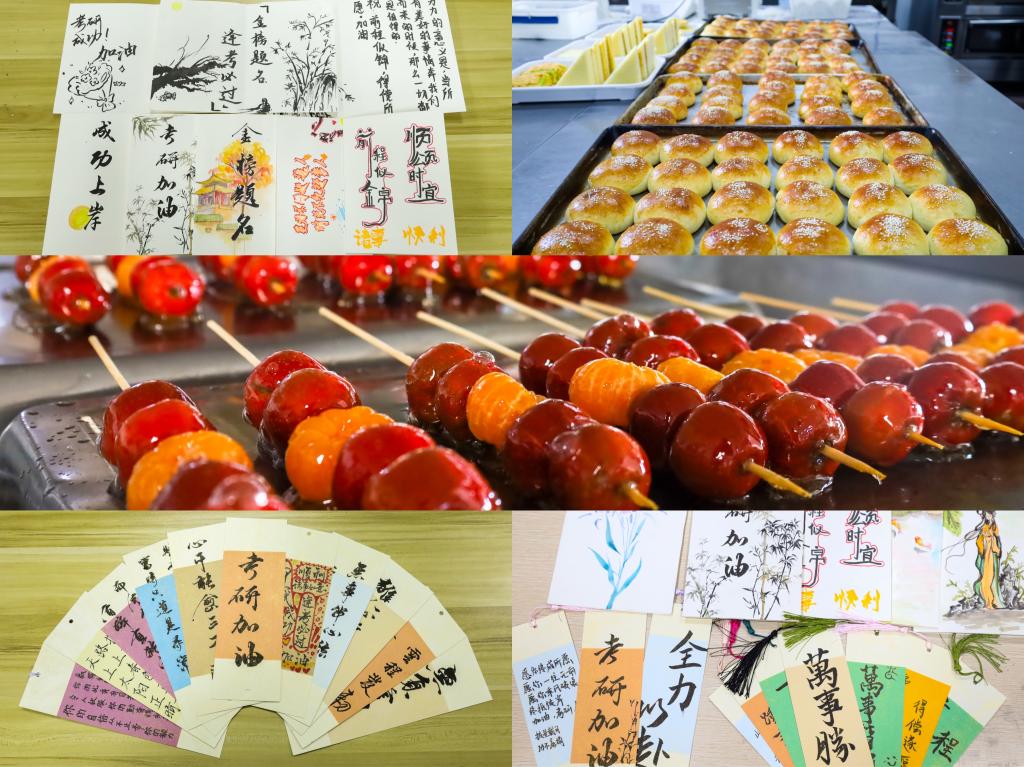 洗净山楂,用竹签串成串,熬制糖液,最后再在山楂上均匀地蘸上一层糖浆,一支精美的糖葫芦就“现身”了。“虽然开始有点手足无措,但在大家共同努力下慢慢就进入状态了。”设计类专业2022级(4)班的徐珈妮在食堂师傅的指导下第一次成功做出了糖葫芦。“希望学长学姐们收到礼物时能有一个好心情,最后带着我们的祝福走进考场。”