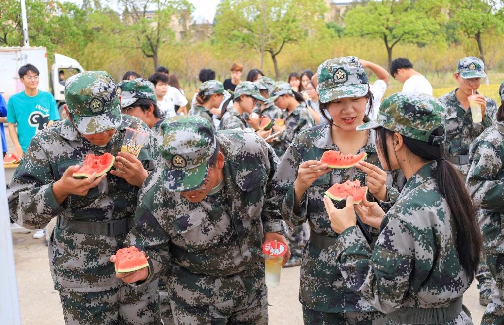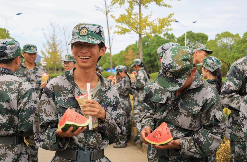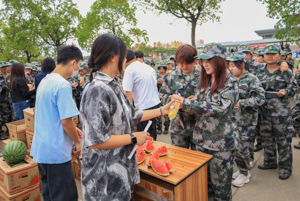 “同学,快来品尝刚刚切好的西瓜!”随着军训解散哨声响起,已经在南田径场门口等候多时的动画专业2021级的汪润向新生们喊到。当看到桌面上已经切好的新鲜西瓜时,“小绿人”们严肃的神情瞬间松弛下来。9月21日下午,beat365在线体育官网登录入口组织近20名2021级学生代表来到南门操场,给学院正在军训的2022级新生们送来一份“清凉”。