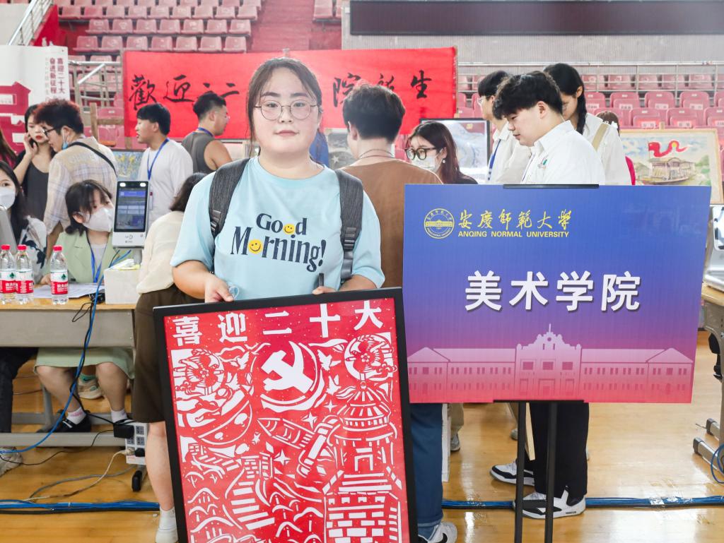 红色剪纸勾勒出蜿蜒壮阔的长城、蓄势待发的火箭;黑色铅笔描绘出疫情当前,国人众志成城、勇担使命;彩色油画棒渲染出形似蛟龙的高铁、筑梦苍穹的宇航员……9月9日,以“喜迎二十大,奋进新征程”为创作主题的270余件作品在龙山校区体育馆与beat365在线体育官网登录入口教学楼展出,为学校迎新现场增添了一道靓丽的风景线。