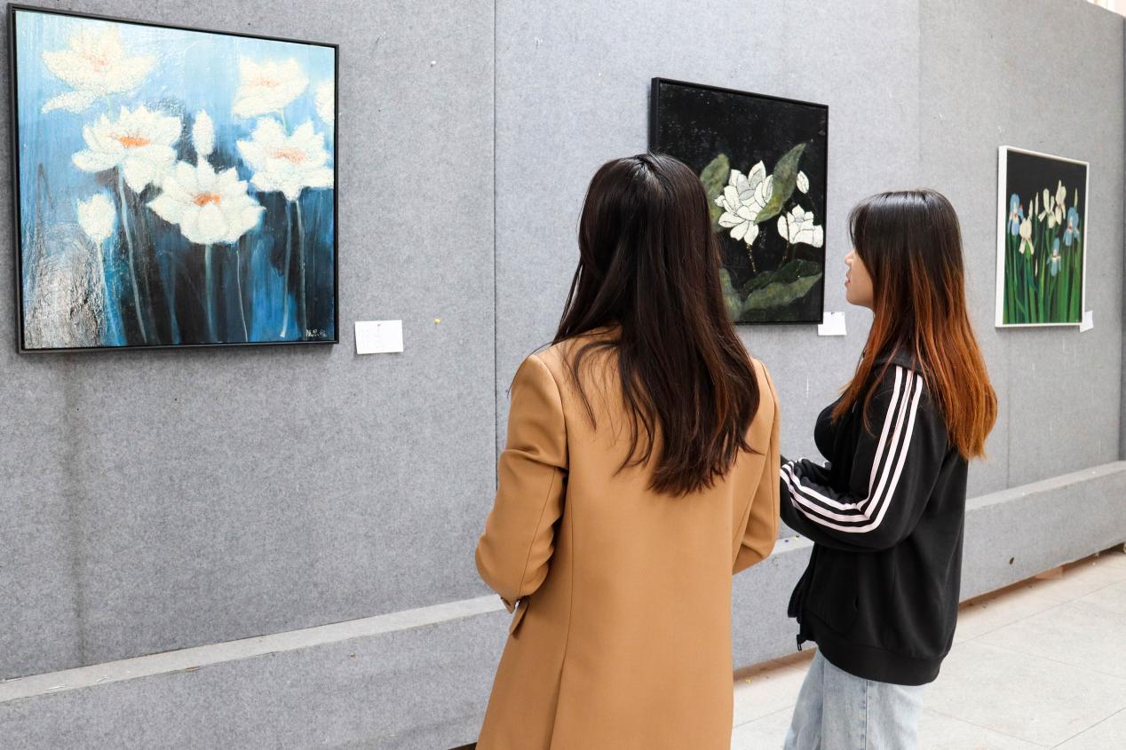 落日余晖下宏伟壮阔的长城、夜晚池塘中含苞待放的睡莲、山坡上破旧不堪的老屋、细雨中古色古香的青石板路……41幅作品生动而精美,吸引了校园许多不同专业学生的关注,学生们纷纷来到展厅欣赏,不时拍照“打卡”。