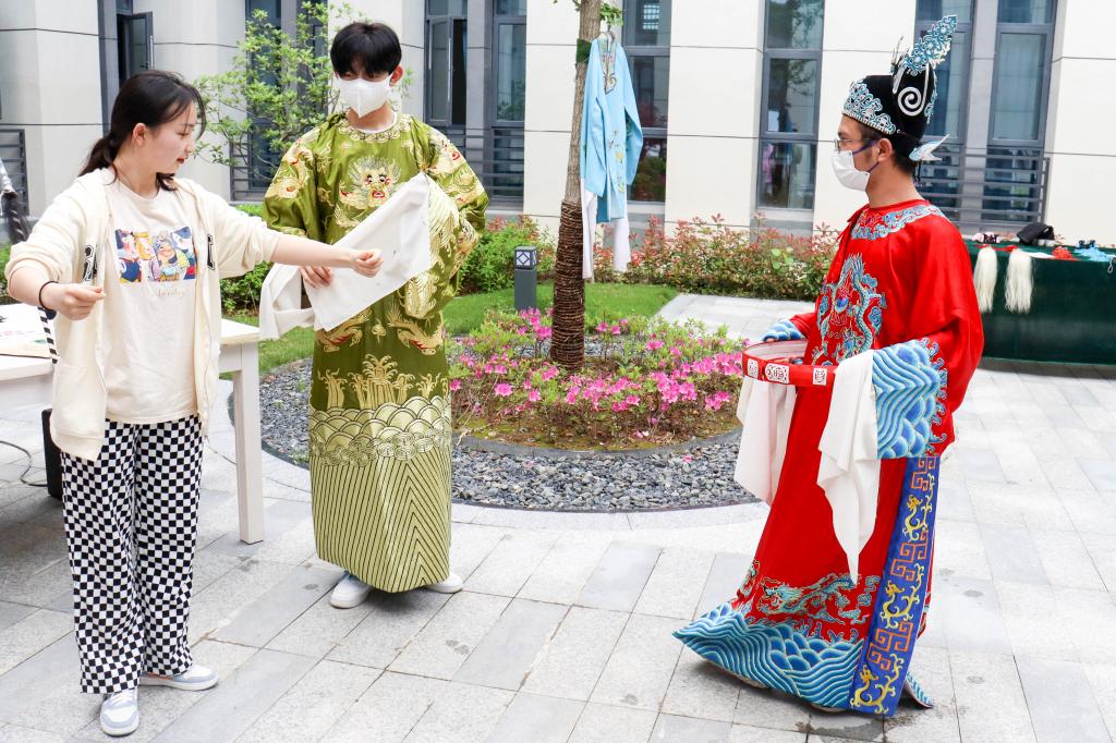 除了道具,beat365在线体育官网登录入口还为学生们“借”来了黄梅剧艺术学院表演专业的学生,为人们进行戏曲表演。黄梅声声入耳、把式专业精彩,学生们在庭院内时走时看,时而穿上戏服,仿佛置身梨园。身穿红色蟒袍,帽插宫花,美术学专业2021(4)班江兆京笑称自己成了“状元郎”,来到活动现场的他迫不及待为自己选择了一件《女驸马》中的戏服,可迫于盔头的重量,不一会儿他就将戏服换了下来。“今天我才真正明白什么叫‘台上一分钟,台下十年功’啊!”他感叹道,自己光是穿这身行头都很困难,很难想象戏曲家们是花了多少工夫才能在台上来去自如的。