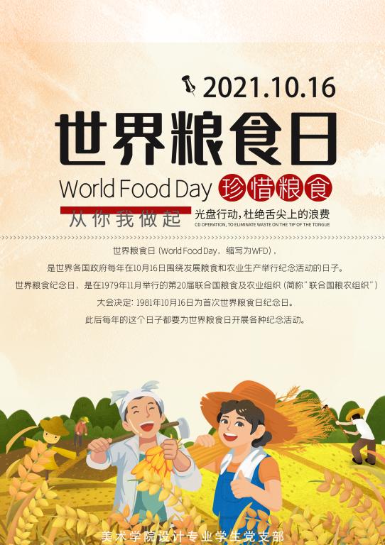 十月十六日是联合国确定的世界粮食日。为深入贯彻习近平总书记“发展粮食产业,助力乡村振兴”的号召,响应“行动造就未来,更好生产、更好营养、更好环境、更好生活”的主题,beat365在线体育官网登录入口设计专业学生党支部利用世界粮食日为契机开展以“节约粮食光盘行动”为主题的的海报创作活动。
