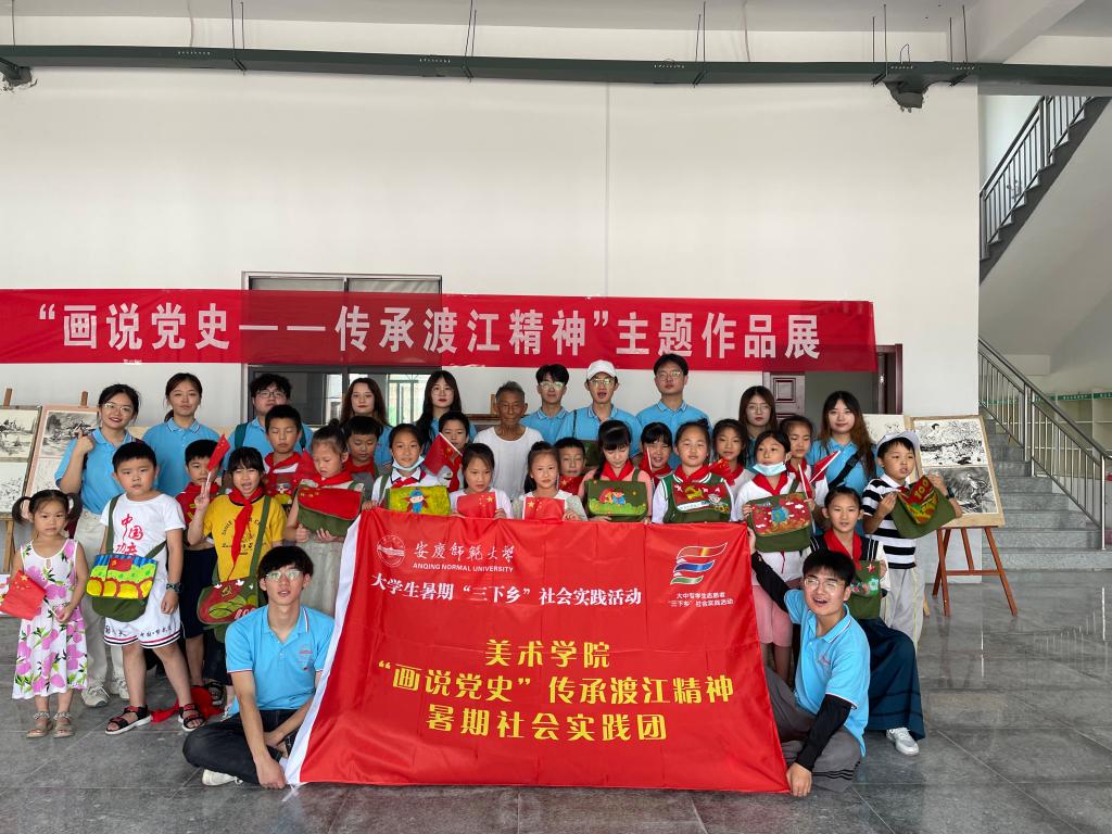 7月19日,校党委副书记吴照明在校团委、beat365在线体育官网登录入口负责同志的陪同下,前往望江县漳湖镇回民村,看望暑期“三下乡”团队“画说党史——传承渡江精神”实践团的成员,并出席主题作品展和专题研讨会。望江县委组织部负责同志,回民村支部书记,安庆丁家小学、漳湖中心小学的30余名小学生及家长等100余人参加了活动。