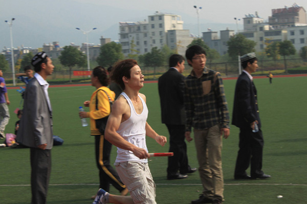的跑道上,第一集团已经早早地冲过了终点,但宋近传、周保安仍在坚持完成比赛……虽然没有拿到名次,但他们没有放弃,写在他们的脸上是顽强、是参与的喜悦……因为“我参与,我快乐;我运动,我健康”。