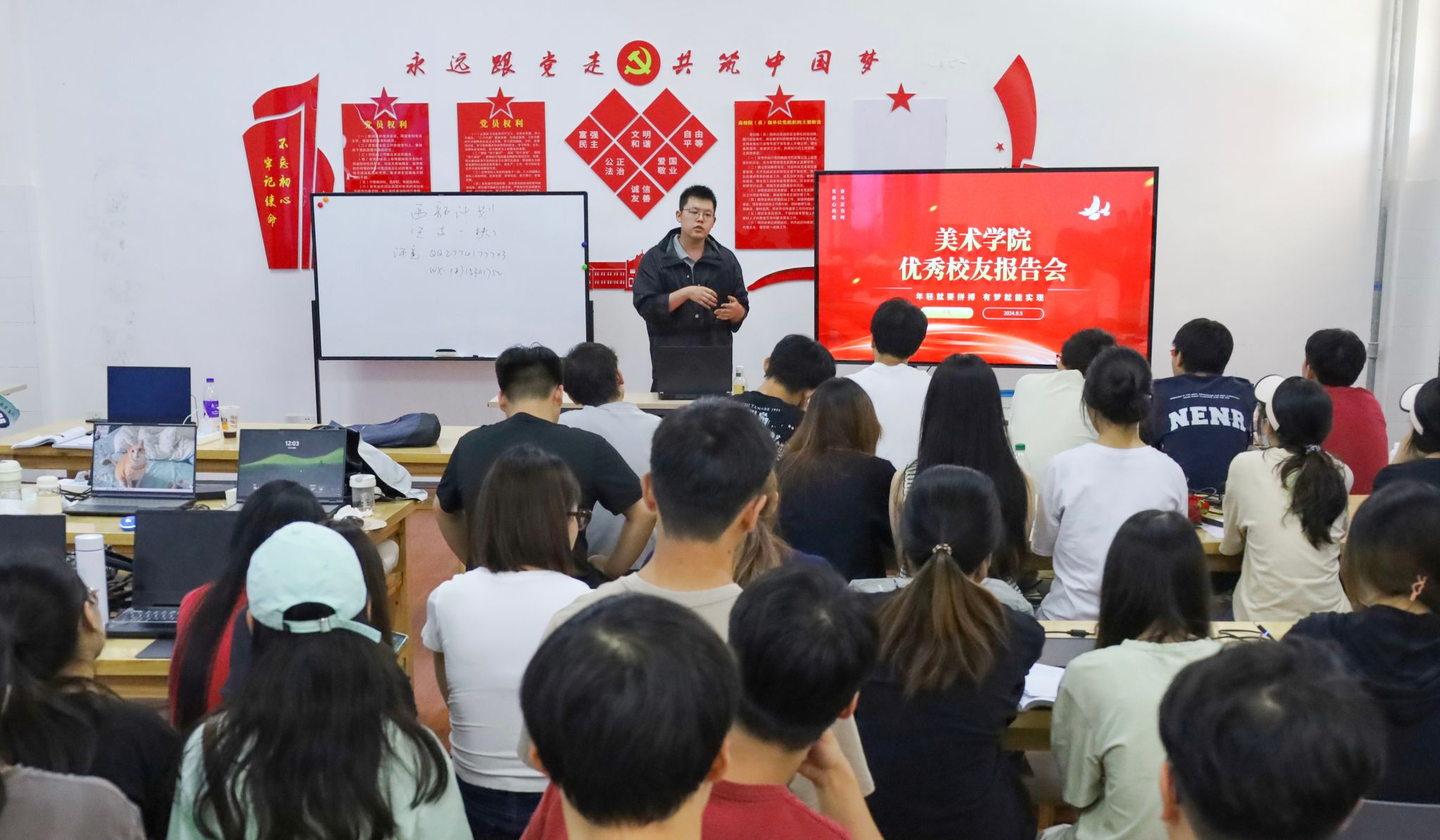 9月5日,beat365在线体育官网登录入口举办优秀校友报告会,邀请学院2022年西部计划志愿者、2022年校“十佳青年”、2022届美术学专业优秀毕业生许竟回母校交流座谈,分享参与“西部计划”的相关经验,学院2021级50余名学生代表到场聆听。