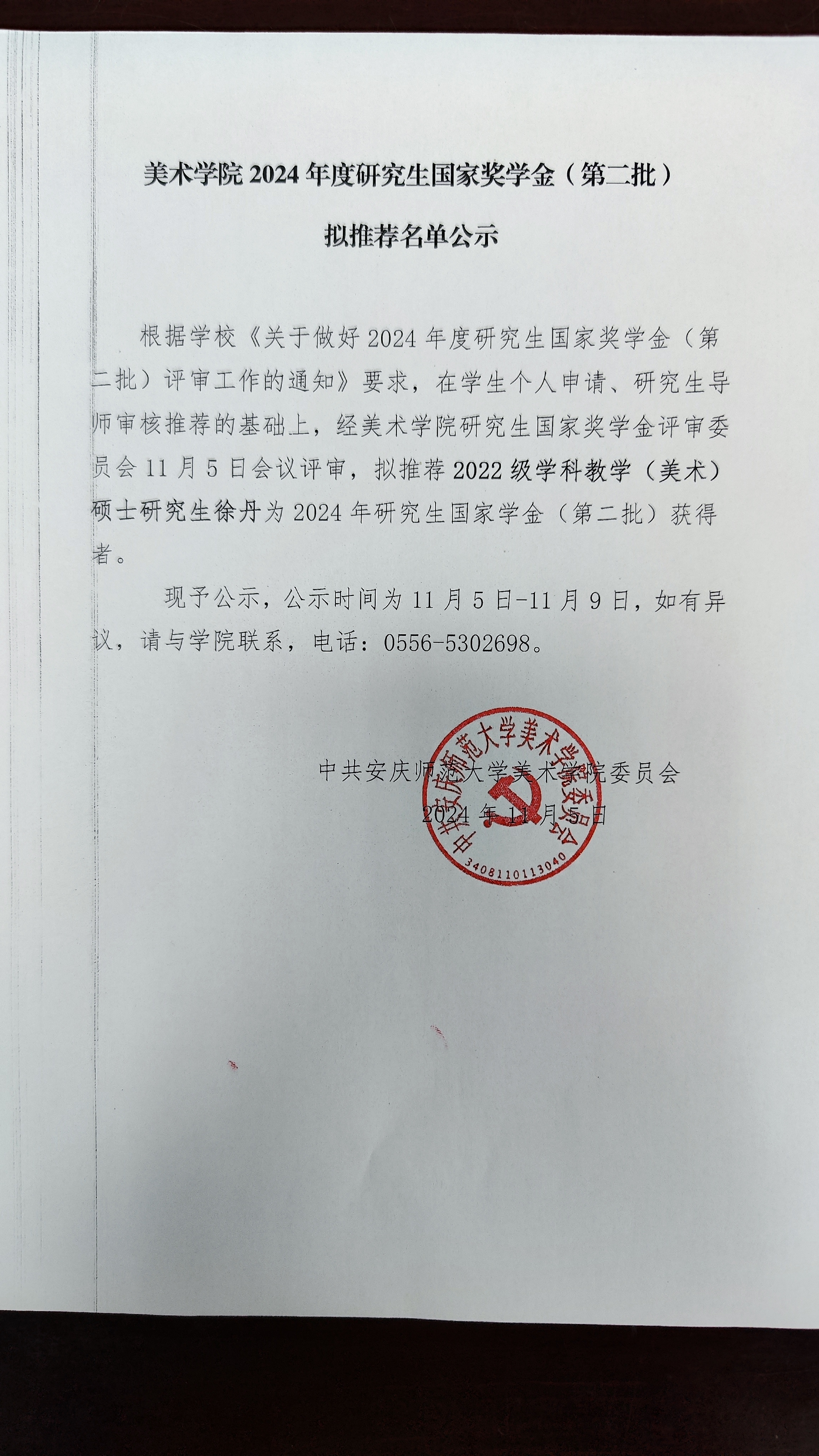 根据学校《关于做好2024年度研究生国家奖学金(第二批)评审工作的通知》要求,在学生个人申请、研究生导师审核推荐的基础上,经beat365在线体育官网登录入口研究生国家奖学金评审委员会11月5日会议评审,拟推荐2022级学科教学(美术)硕士研究生徐丹为2024年研究生国家学金(第二批)获得者。