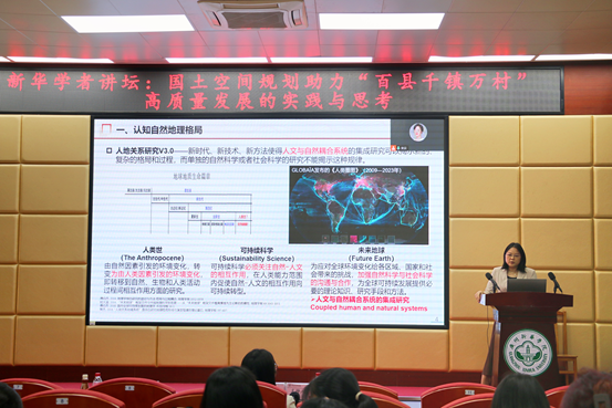 龚蔚霞从地理学角度分享了人地关系阶段的演变过程,希望同学们积极面对环境变化挑战,探索基于资源环境禀赋特征的“双评价”研究。她通过分析城乡区域差距,指出区域不均衡发展的普遍性问题,介绍了我国通过乡村振兴战略持续带动乡村“自我造血”能力的策略。