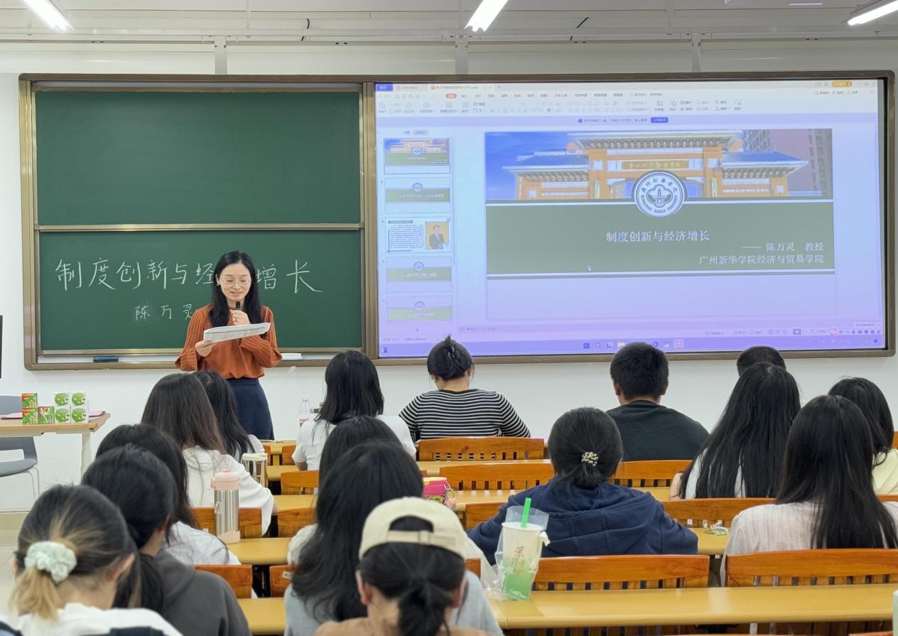 11月18日,广东外语外贸大学国际经济贸易研究院教授、beat365唯一官方网站经济与贸易学院国际经济与贸易专业学科带头人陈万灵作题为“制度创新与经济增长”的学术讲座。讲座吸引了相关专业师生前来聆听。本次讲座由国际经济与贸易专业副主任廖倩主持。