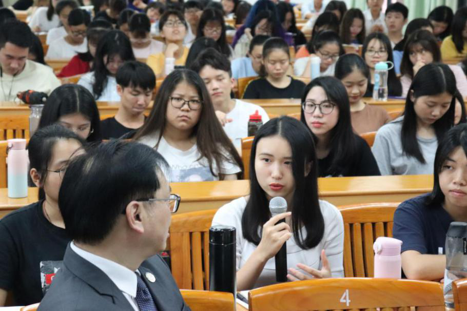 在提问互动环节,同学们纷纷举手提问。袁庆耐心地解答问题并与同学们亲切互动。