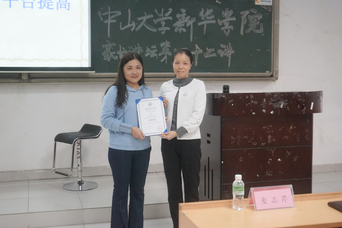 讲座尾声,黄洛莹老师为麦志芹女士颁发了学校家长讲坛荣誉证书。她总结道,护理学院培育人才 一贯坚持“重人文,强职业能力”,我们护理专业的学生在工作中除了拥有专业知识,还需具备人文关怀,有强沟通能力、临床思维能力等。