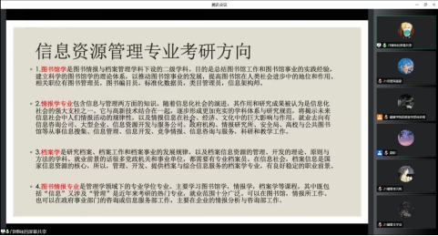 邝博咏从自我介绍、为什么考研、考研前期准备、怎样准备初试和复试这四个部分为同学们讲述了她的备考过程。其中,她还为信息资源管理专业的学生提供了大致的考研方向。