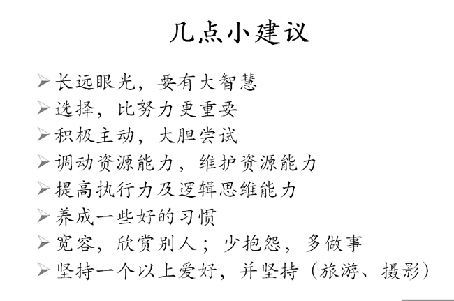 大学至今以来的这些丰富人生经历,让孙昊校友感悟良多,而他也告诫同学们:人的精力是有限的,因此只需专注做好两三件事;不管牌是好是坏,打好自己手中的牌,把握住来之不易的机会;每次转型都要提前考虑好,来到一个地方或担任上一份职务,就要把心态端正,做好自己的本分工作;在转职时应善始善终,把现有的工作完成好,做出好成绩,以此在行业内证明自己的能力,为自己下一份工作铺路。