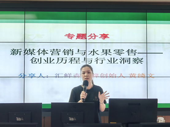 黄绮文以“新媒体营销与水果零售”为主题,讲述了她从实体店到线上社区运营的转型历程,并分享了线上线下融合营销的策略以及抖音等新媒体平台的实战经验。她的深刻洞察和实战智慧赢得了现场师生的热烈掌声和高度赞誉。