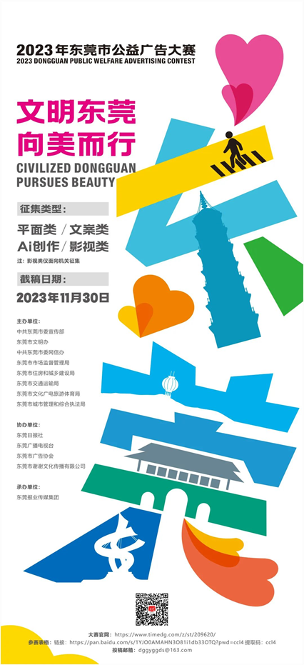 “文明东莞·向美而行”2023东莞市公益广告大赛,旨在以城市美学赋能公益宣传,以公益广告传播城市文明、助力基层治理、推动社会进步,让文明浸润更多生活场景,启发人们的思考,引领人们的行动,让“双万”东莞更加美好。