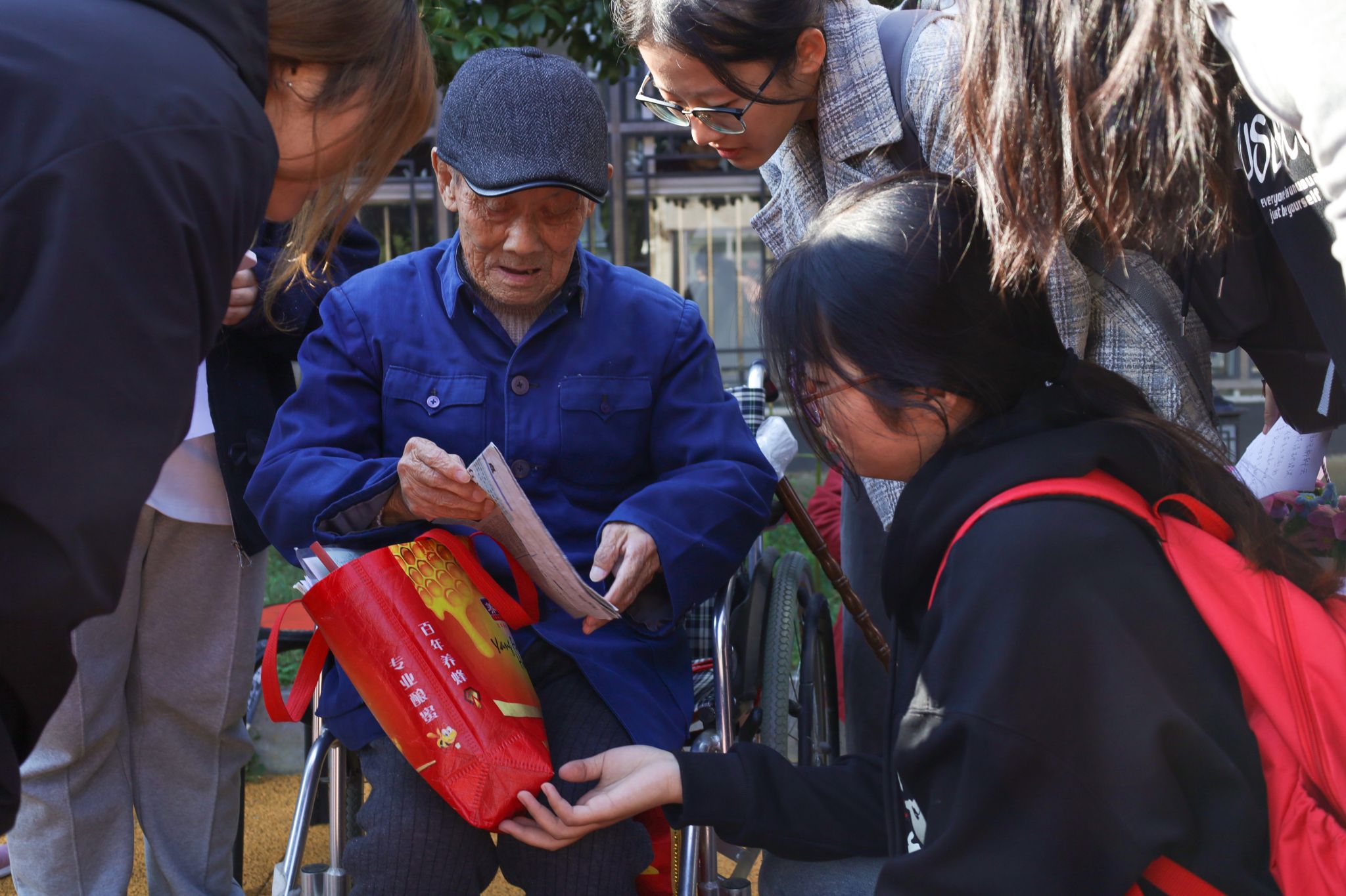 临走前,许吉言将学生们赠送的扭扭棒永生花与围巾放入轮椅上的袋子中,并鼓励他们立志修身、向上向善,磨练意志、增长才干,不断地为国家发展焕发青春正能量。据了解,在敬老之行前一周,学院学子齐聚学院学术报告厅,手工制作永生花,并挑选秋冬保暖性能好的围巾,寄托对老人的重阳节祝福。