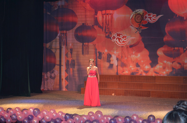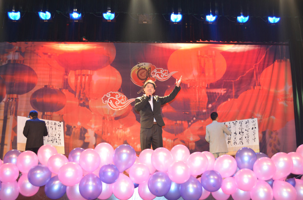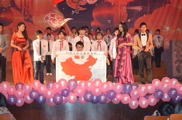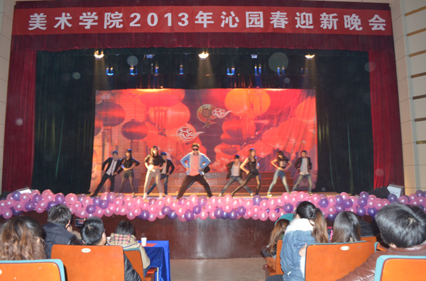 伴随着动感的开场舞《江南style》,晚会正式拉开了序幕。恢弘大气的诗朗诵《沁园春·雪》登上舞台,节目采用了一人朗诵两人进行书法表演的形式,不仅完美的契合了晚会的主题,更是展现了美院学生的专业特色。未见人,先闻声,在一阵叮咚的流水声后,灯光乍现,由夏艳等同学带来的舞蹈《嬉水》带给观众惊艳的视听感受,而cosplay真人秀表演更是引得动漫迷们尖叫连连,现场的掌声和欢笑不断,将晚会推向了第一个高潮。《change》、《肚皮舞》和《机械舞》3支各具特色的舞蹈闪亮登场,演员们高难度的技巧动作,丰富的肢体语言表达,令现场同学们赞叹不已。歌曲《因为爱情》男女深情对唱,更是让观众心中涌起一阵阵暖流。唯美的舞蹈《画中仙》,让现场观众们如临仙境,更是体现出美院学子的多才多艺与青春活力。小品表演《飞机场的那点事》将本次晚会推向了第二个高潮,演员们夸张的肢体动作与丰富的表情,逗得现场观众放声大笑。具有浓郁安庆特色的黄梅戏《到底人间欢乐多》,让大家充分感受黄梅戏的魅力和风采。 “在世界的国,在天地的家,有了强的国,才有富的家……”手语表演《国家》让广大同学们体会到了美院这一大家庭的温暖,歌颂了对祖国的无限热爱,同时也唱出了广大同学对党的十八大所描绘的美好生活蓝图的期盼。晚会结束后,出席晚会的领导、老师和嘉宾上台与全体演职人员合影留念。
