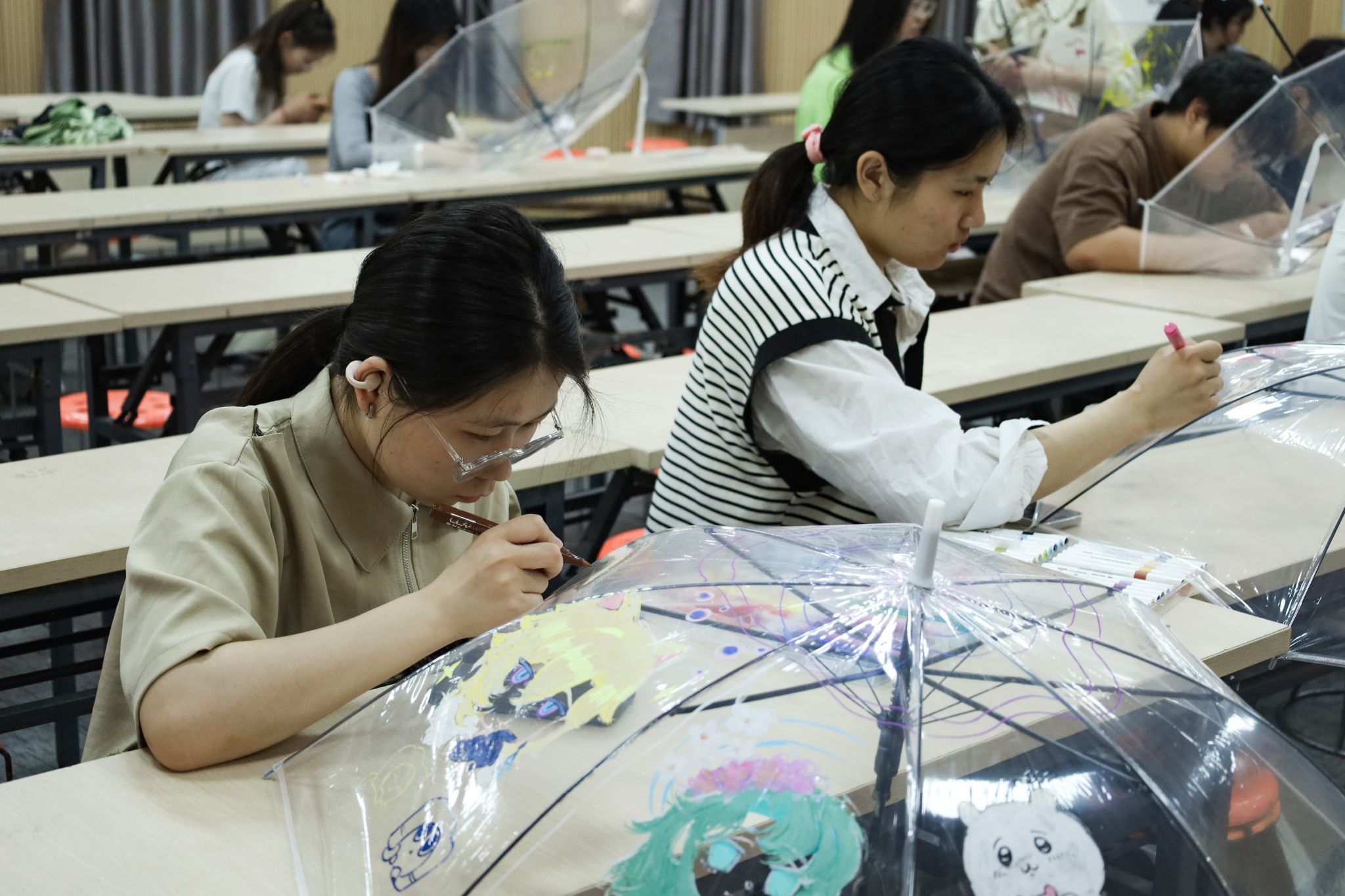 “夏季是一年中降水最多的季节,绘制完成的透明雨伞刚好可以给同学们用于遮风挡雨。此外,希望通过此次活动,参与同学能在燥热的天气中静心创作。”谈及举办此次活动的初衷,活动负责人、动画专业2023级的张楠楠介绍。为了让参与学生拥有更好的体验感,张楠楠与学院动漫俱乐部的管理人员提前准备了25把透明雨伞与4盒丙烯颜料笔。