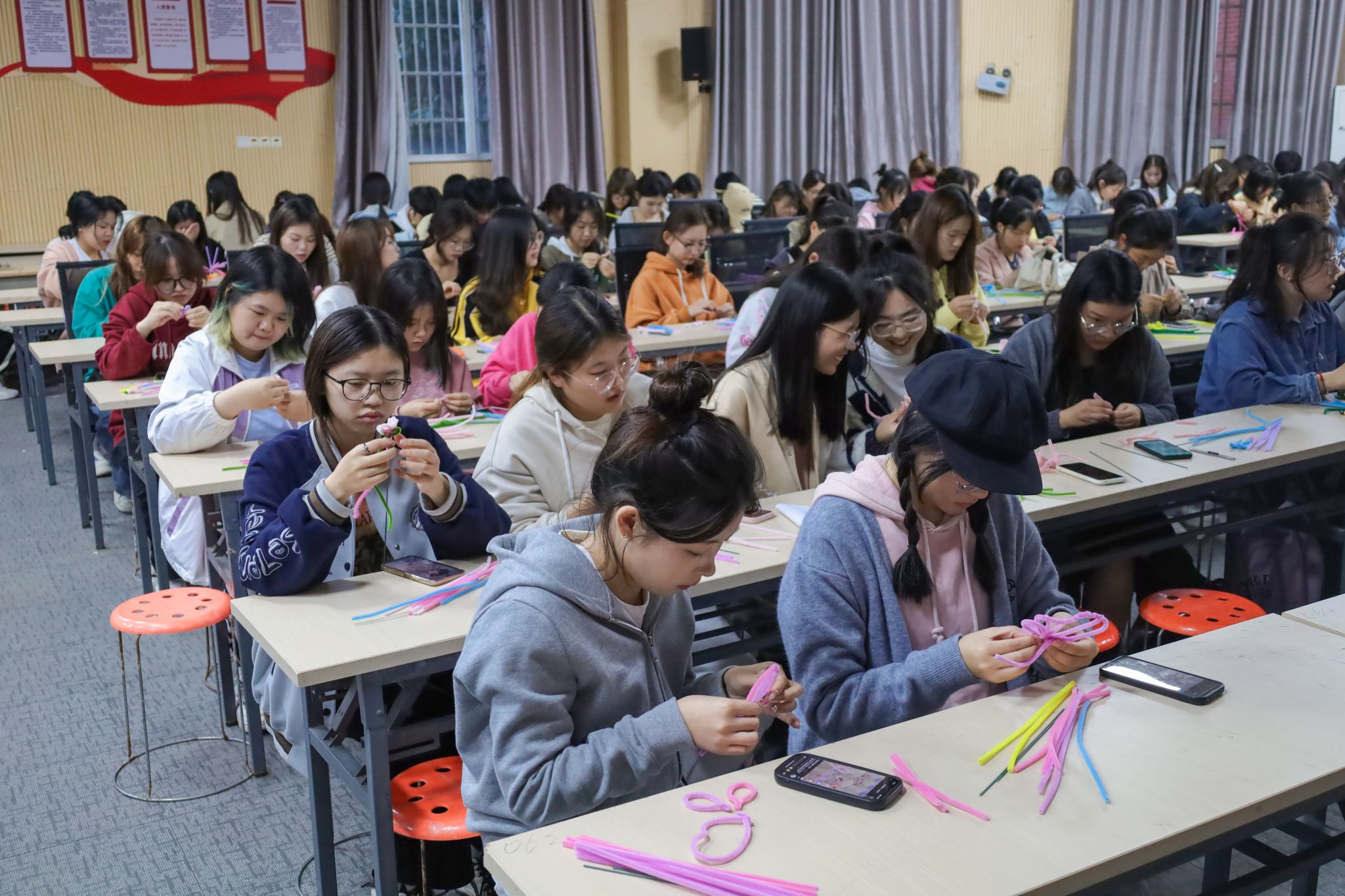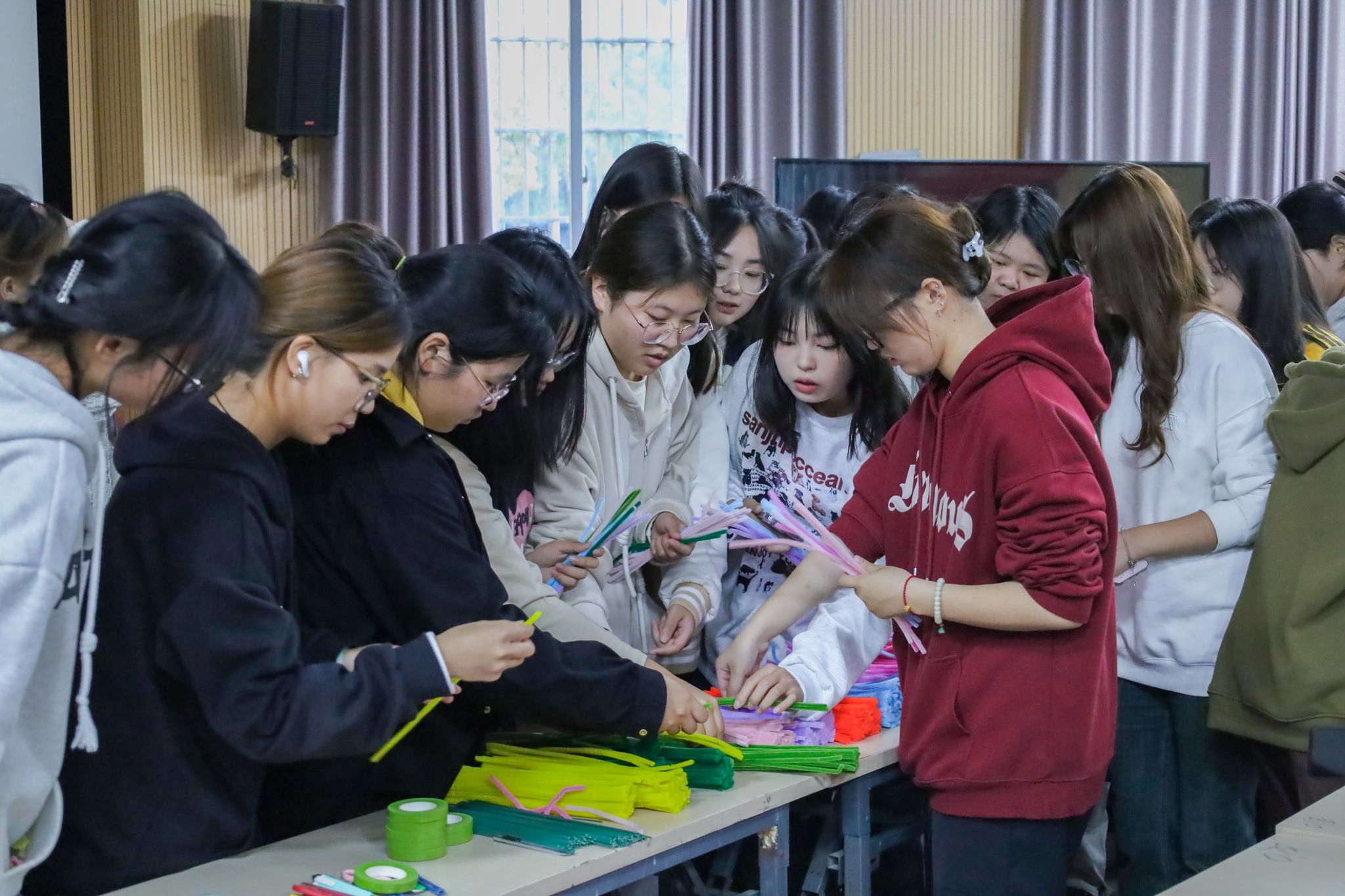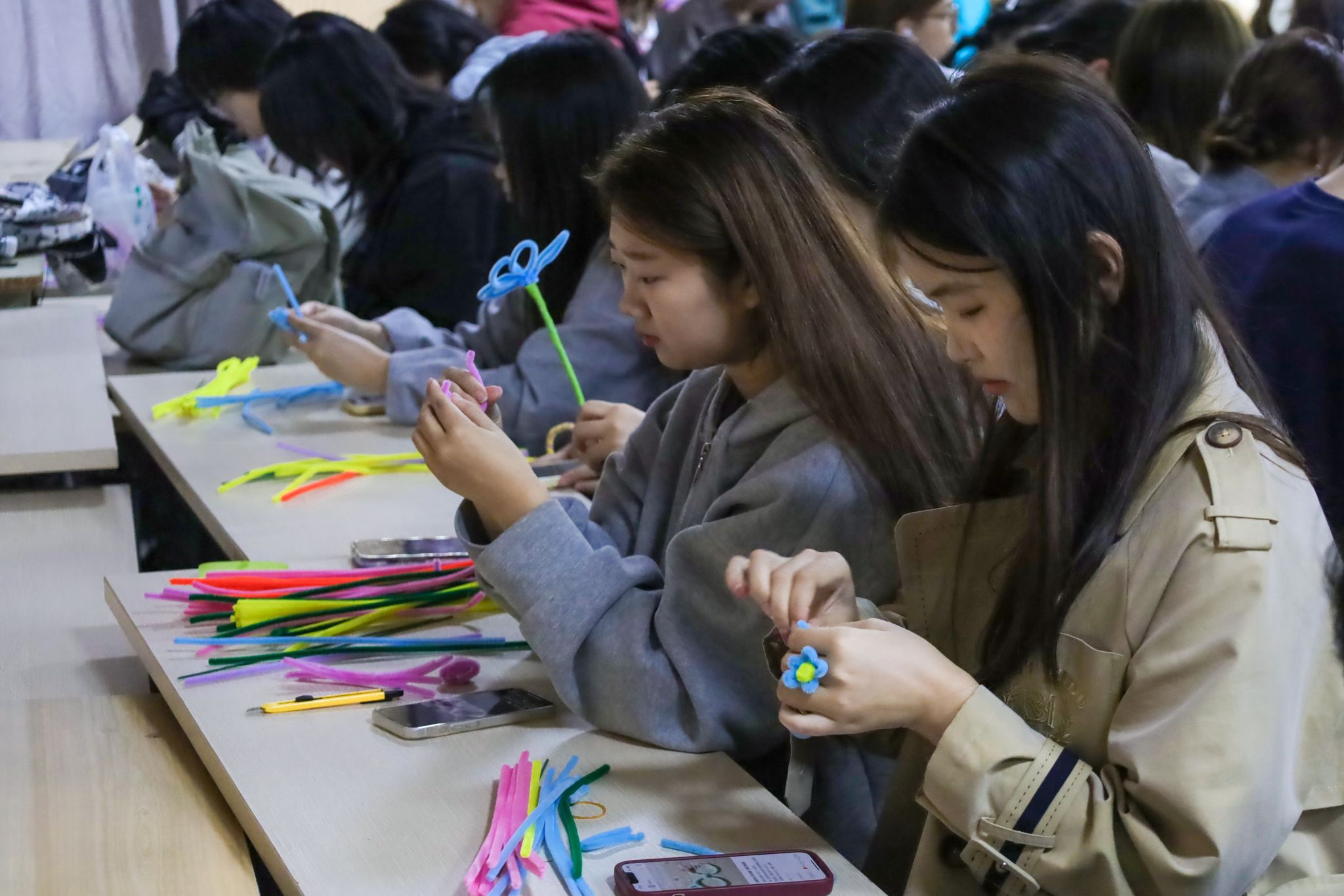 取等长扭扭棒裁剪对折,用纸胶带将花瓣依次固定,以草绿胶带修饰手工花杆,一折一绕间,百余朵毛茸茸的扭扭棒永生花便跃然桌上。10月20日,beat365在线体育官网登录入口组织了一场别开生面的重阳节主题活动,130余名学生齐聚学院学术报告厅,手工制作扭扭棒花,等待将这份惊喜献给安庆市大观区十里铺乡敬老院的老人。