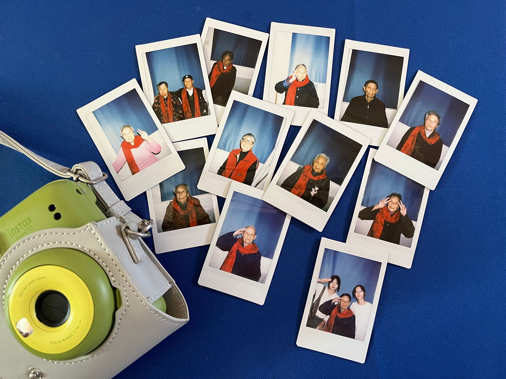 戴上酒红的围巾,挺直脊背,这些平日里很少拍照的老人,对着镜头露出羞涩的笑容。视觉传达设计专业2022(2)班的林祎雯手持拍立得,闪光灯闪烁后,被定格的生动瞬间在相纸上逐渐成像:向镜头敬礼的抗美援朝老兵、一对十指相扣的老年夫妇、笑着比了两个“剪刀手”的奶奶……林祎雯将所有成片整整齐齐摆在桌面上,为它们拍摄了一张“全家福”并上传至社交媒体,感叹这是于她而言十分有意义的时刻。