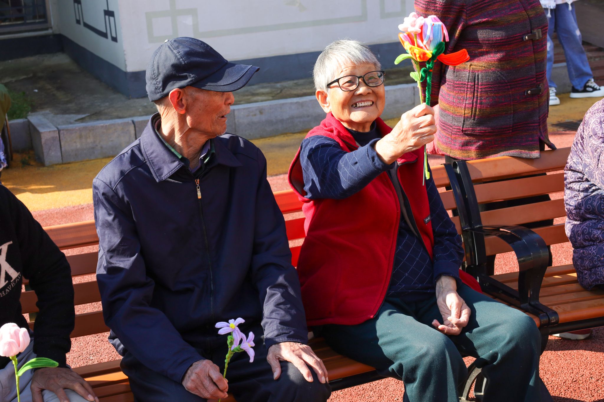 第一个收到手工永生花的是正坐在庭院长椅上晒太阳的李奶奶,她在花束中挑选了一支粉色郁金香,举起来对着阳光仔细端详。在得知花束均由学生手工制作时,她感到十分惊喜,不停地跟同行的老奶奶赞叹学生们手艺的精巧,并将这朵永不凋零的郁金香放在枕边。不到半小时,50余朵手工花全都作为见面礼,“占据”了老人们房间内的最显眼的位置。