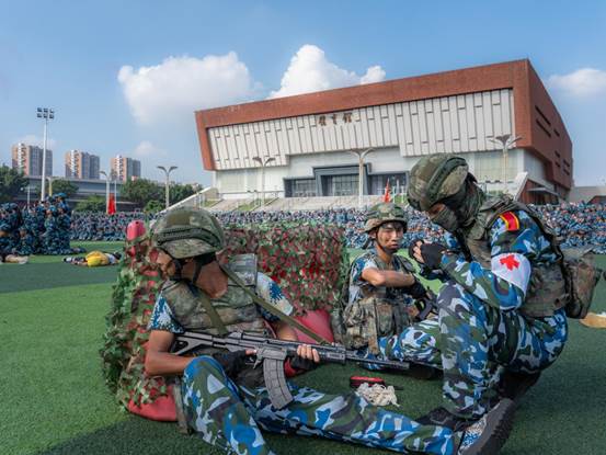 2024年在南沙区人民武装部、学校领导的大力支持下,学校严格按照《普通高等学校军事课教学大纲》制定军事训练科目与计划,周密地安排训练科目并创新军事训练内容,包含匍匐前进、战地救护、模拟射击等训练项目,想方设法增强“军味”。