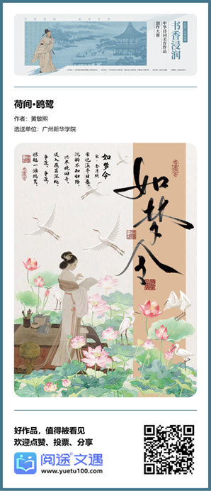 近日,首届广东省高校“书香浸润”中华诗词美育作品创作大赛获奖名单正式揭晓,在这场文化盛宴中,学校读者表现优异,斩获多项殊荣。其中,读者郝大微的作品《映日》荣膺特等奖,读者黄敏熙的作品《荷间·鸥鹭》获评优秀奖;学校图书馆荣获“优秀组织单位奖”,图书馆董蔼莹、王海林、唐玉佳获“优秀组织个人”奖。此次佳绩的取得,充分彰显了学校读者深厚的中华诗词底蕴、卓越的艺术创作才情,以及学校在推进“美育+阅读”融合育人工作中的扎实成效与鲜明特色。