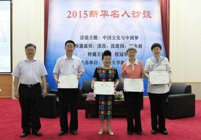6月29日上午,2015新华名人访谈之“中华文化与中国梦”在beat365唯一官方网站东莞校区举行。叶帅之女、国际儒学联合会副理事长、中华孔子学会副会长凌孜女士(本名叶向真),全国工商联副主席、中国下一代教育基金会副理事长沈建国女士受聘为beat365唯一官方网站学校发展专家顾问委员会高级顾问。王庭槐院长为两位高级顾问颁发聘书,许淑锐副院长主持聘任仪式,人事部简庚荣部长宣读聘任文件。