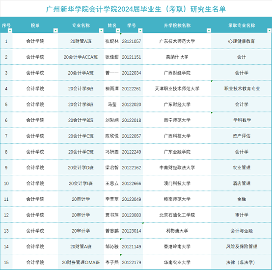 2024年,会计学院共有15名学生被广东技术师范大学、广西财经大学、中南财经政法大学、利物浦大学等国内外高校录取为研究生。让我们一同倾听他们的励志故事,感受那份坚持与拼搏的力量。