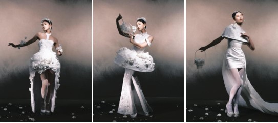 本系列以“白”为主题展开三款女装设计,聚焦白瓷的纯净质感与女性身体曲线的共生关系。采用挂脖抹胸上衣,裙身以硬衬塑造仿瓷瓶直筒廓形,采用超轻粘土模拟瓷花,裙身表面叠加浮雕花纹刺绣,通过收腰设计凸显腰部曲线,裙摆边缘嵌入铁丝,整体造型虚实对比强烈,兼具传统韵味与现代时尚。