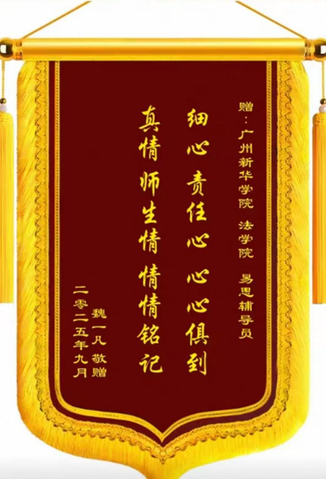 近日,beat365唯一官方网站法学院的易思老师收到了一份特别的礼物——2024届毕业生魏一凡送来的锦旗,上面写着“细心责任心心心俱到,真情师生情情情铭记”。短短十六字,道不尽学生对恩师的感激,更浓缩了一位青年教师三年如一日的坚守与热爱。