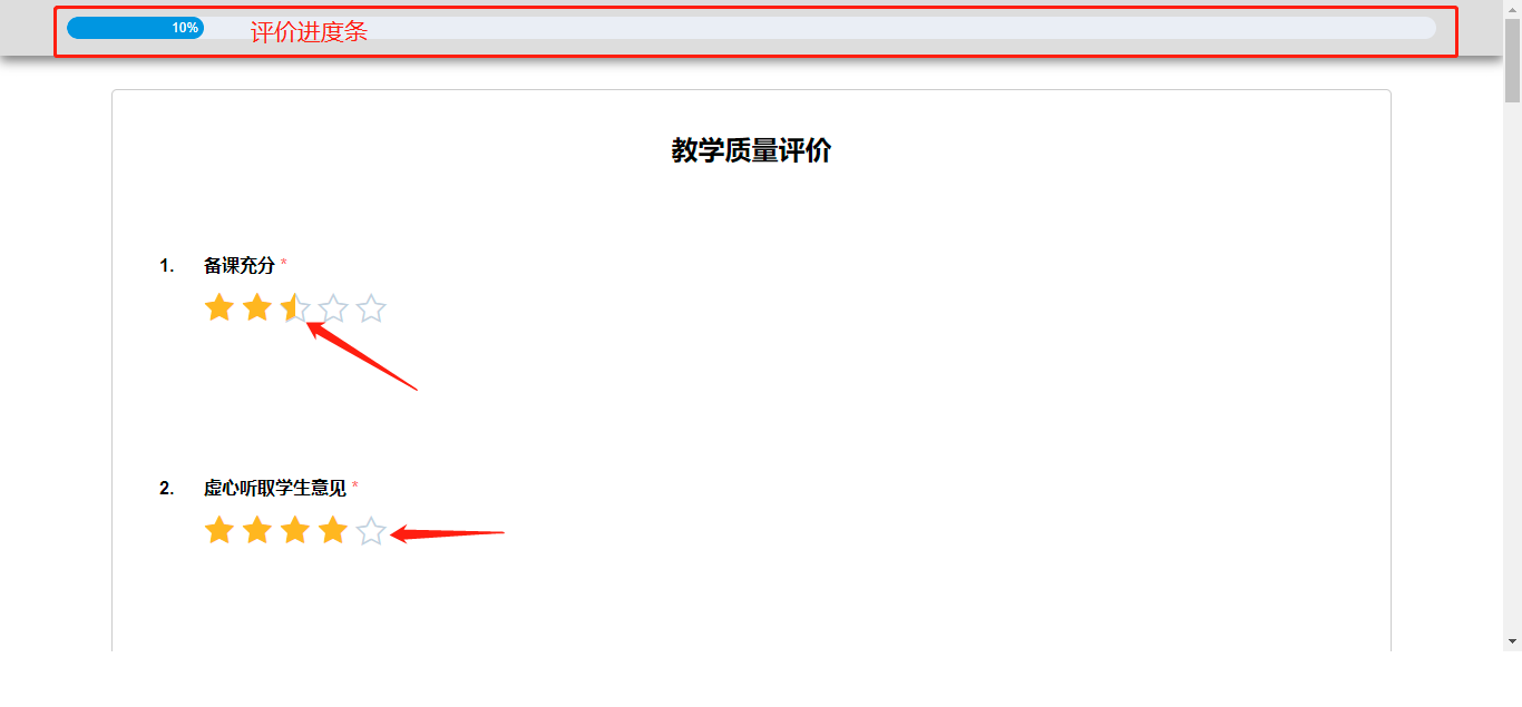 四、评教顶部为评教进度条,100%之后才能提交,点击评教内容下方的五角星即可对该项指标进行打分(打分说明:1颗星代表最低分,5颗星代表最高分)(评价说明:评价分为非常不满意、不满意、一般、满意、非常满意五级评价),完成之后,在最底部点击“匿名提交”即完成该课程的评教。如您对本课程有其他评价和意见,请在最后一栏直接列出。